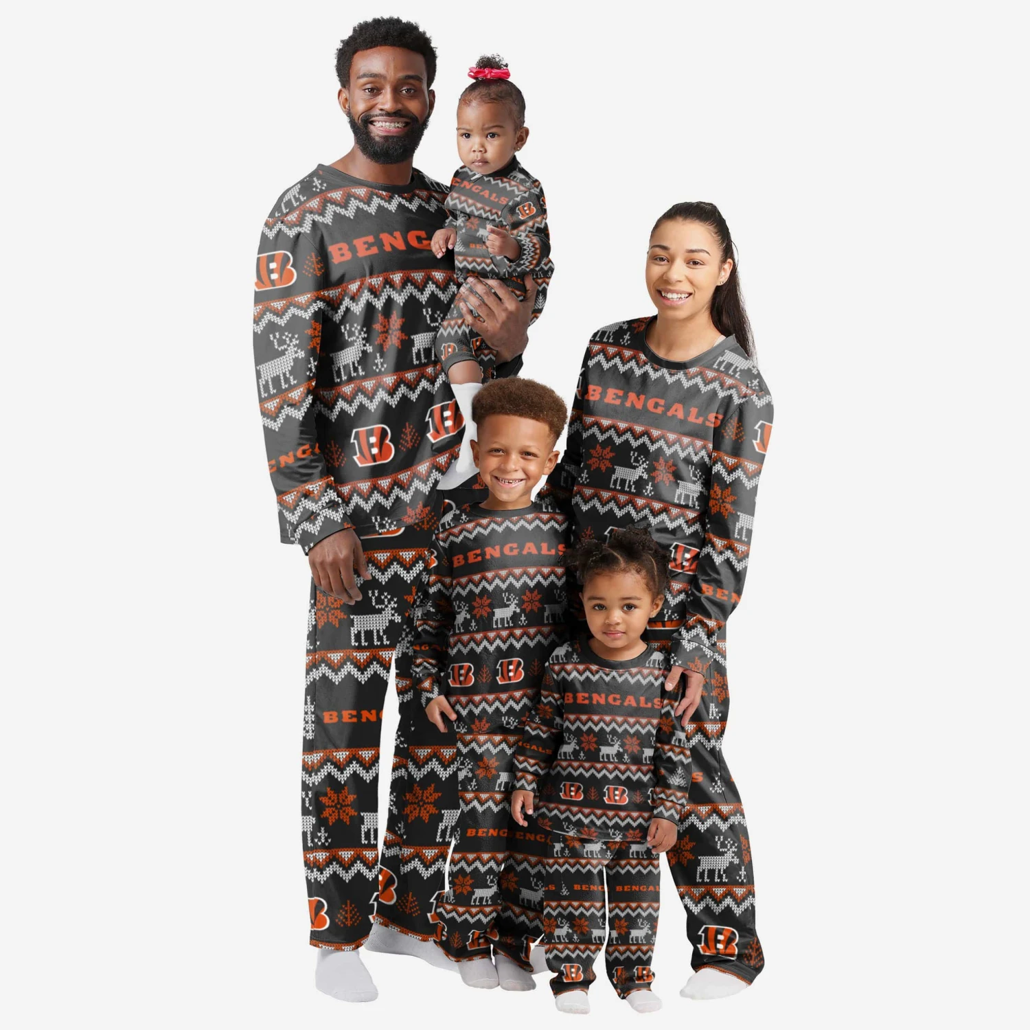 Get your young fan started early this holiday season in these Cincinnati Bengals Infant Ugly Pattern Family Holiday Pajamas! Your baby will absolutely love these matching Christmas pajamas! Make sure your infant enjoys sweet dreams filled with holiday joy by having them sleep in infant pajamas. Don’t forget to take your holiday photo with the whole family wearing matching Christmas pajamas!