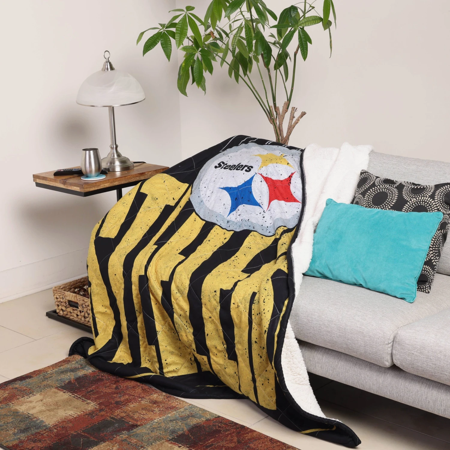 Go big or go home? No – Go big AT home! Make a big, bold statement on who you’re rooting for on gameday by relaxing under this Pittsburgh Steelers Big Game Sherpa Lined Throw!