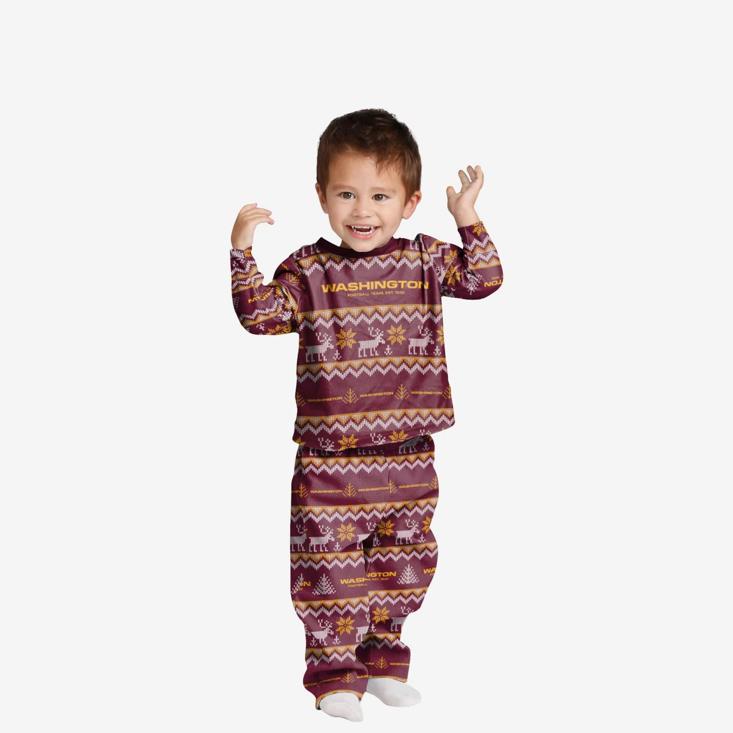 Get some matching family pajamas and dress to impress this holiday season! You won’t want to miss these kids’ team pajamas! These youth PJ’s are comfortable and show off your team spirit in the form of some sweet youth jammies. Introducing the Washington Commanders Toddler Ugly Pattern Family Holiday Pajamas! Don’t forget to take your holiday photo with the whole family wearing matching Christmas pajamas!